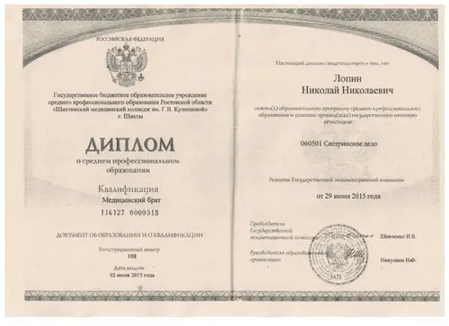 Окончил Шахтинский медицинский колледж им. Г.В. Кузнецовой и Центр повышения квалификации специалистов со средним медицинским и фармацевтическим образованием по направлению - Сестринское дело в наркологии.